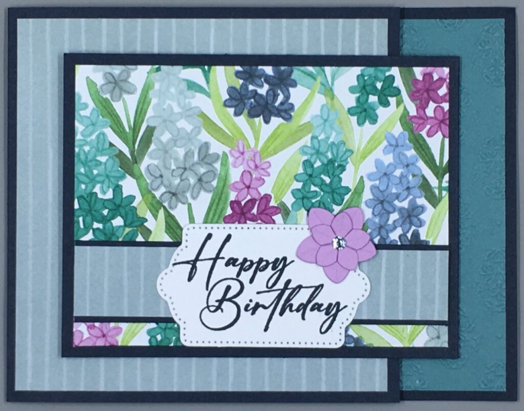 Today’s card is the first in a series of 4 cards featuring the Florals in Bloom Designer Series Paper. This card has a regular A2 size card base with an inner smaller card base creating an interlocking double card base card. This is a simple fun fold card that can feature DSP or Embossed cardstock or a combination as used in the sample. The inside features some of the stamps in the coordinating Pretty Florals stamp set.