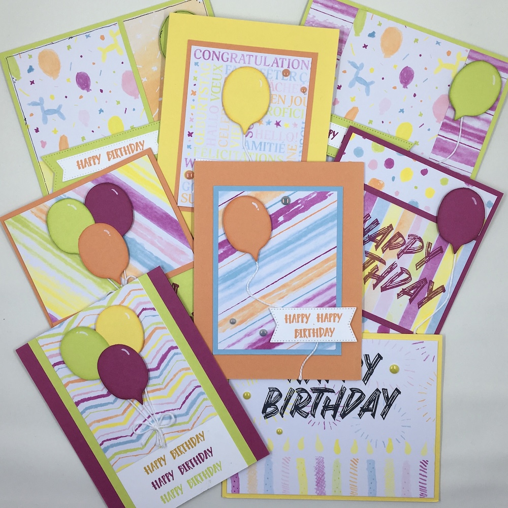 Kit includes 8 cards total: 1 of each of the designs pictured above. Extra materials: White Gel Pen, Sponge Daubers, inks for sponging the balloons (Brown always works for sponging, but the sample uses the same ink colors as the cardstock which is listed in the tutorial.)
