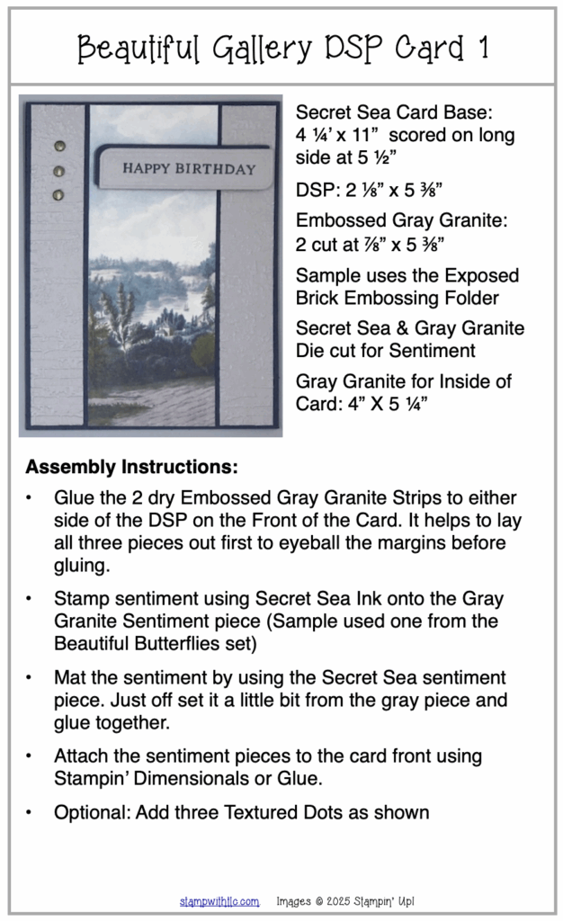 This week’s card concludes the Beautiful Gallery Designer Series Paper card set. Below is a bonus card made with the other half of the DSP used to make the card above. This is a thick card so you will be charged extra postage, even though it does squeeze into a regular A2 envelope (Stampin’ Up Medium Envelope). All the measurements and instructions can be found on the free downloadable Instruction Sheet below.