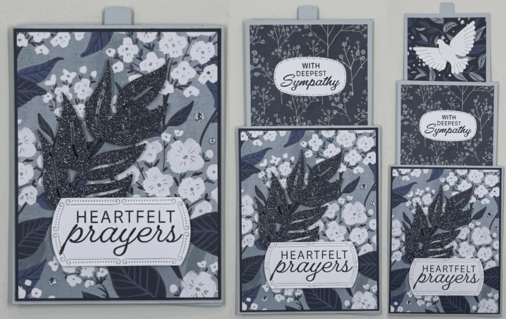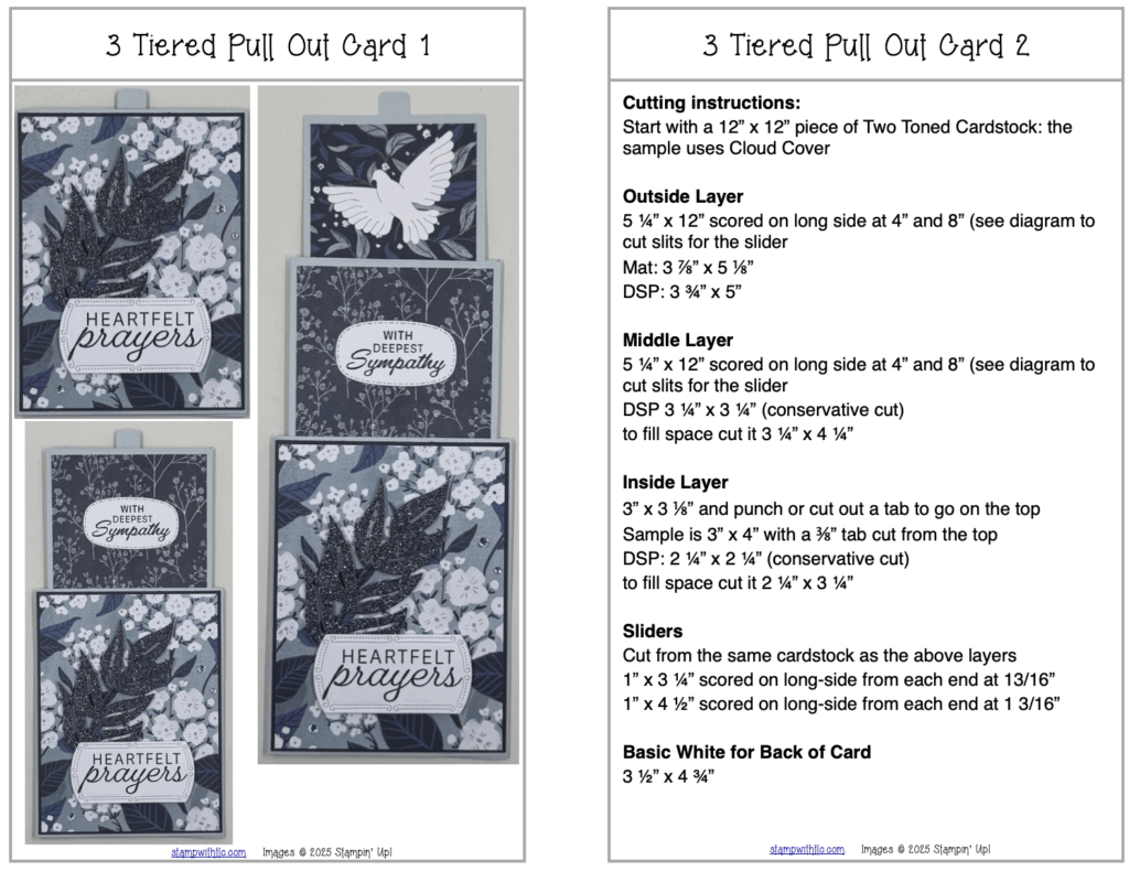 This week’s card is a three tiered pull out card featuring the Peaceful Garden Suite which has beautiful florals combined with white doves. These cards lend themselves to be sympathy as well as Christmas or winter birthday cards. Whatever the reason it is a wonderful card to make and give. For measurements and assembly instructions check out the free pdf file below the materials list.