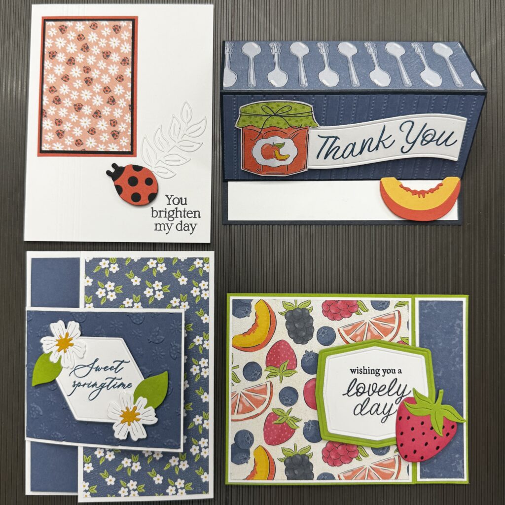 We will be making 6 cards in this class — two each of three different Z-Fold card designs.